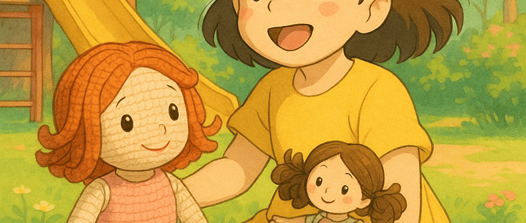 As duas bonecas ficaram empolgadas! Filha, que era mais experiente, ajeitou os cabelinhos da Filha da Filha e disse: