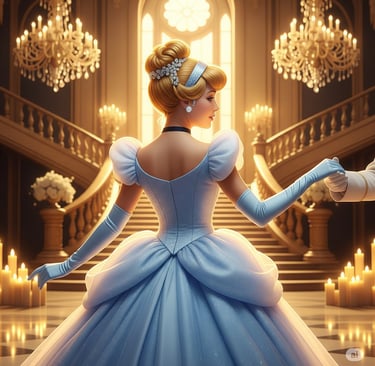 Cinderela ficou muito triste e foi para seu quarto no sótão. Lá, ela olhou pela janela para o castelo e começou a chorar. Foi então que, de repente, sua fada madrinha apareceu! Com um toque mágico, ela transformou os retalhos em um lindo vestido de festa e uma abóbora em uma carruagem dourada. Seus amigos da floresta se tornaram cavalos e ajudantes para levá-la ao baile.