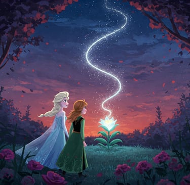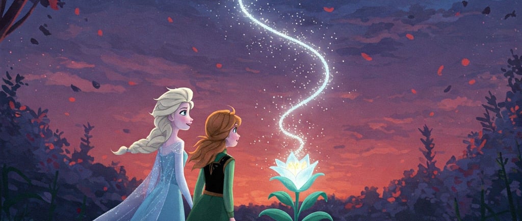 Elsa gently touched the seed with her icy magic. It sank into the earth, and from it grew a shimmering flower, opening slowly and sending out a warm, magical breeze.
