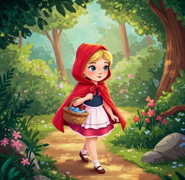 Little Red Riding Hood gave her mom a kiss and happily set off, humming and watching the colorful butterflies along the way.