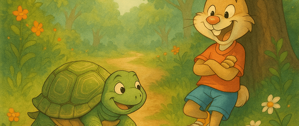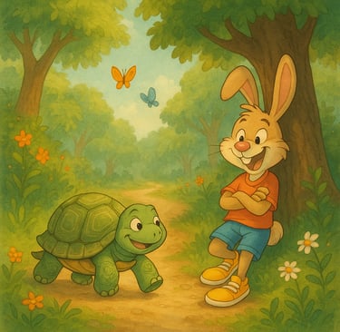 ¡Era la tortuga! Todos se quedaron boquiabiertos. ¿Cómo una tortuga, tan lenta y tranquila, se atrevía a desafiar a la liebre?