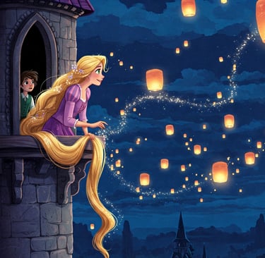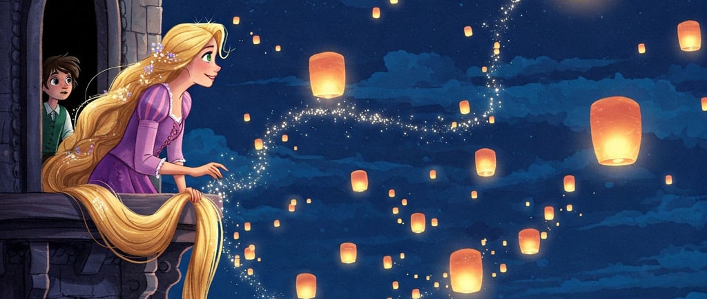 Apesar do isolamento, Rapunzel cresce cheia de curiosidade e esperança. Todos os anos, no dia de seu aniversário, ela observa da janela da torre um espetáculo de luzes flutuantes vindas do reino — sem saber que são lanternas lançadas pelos seus verdadeiros pais, na esperança de que a princesa um dia retorne.