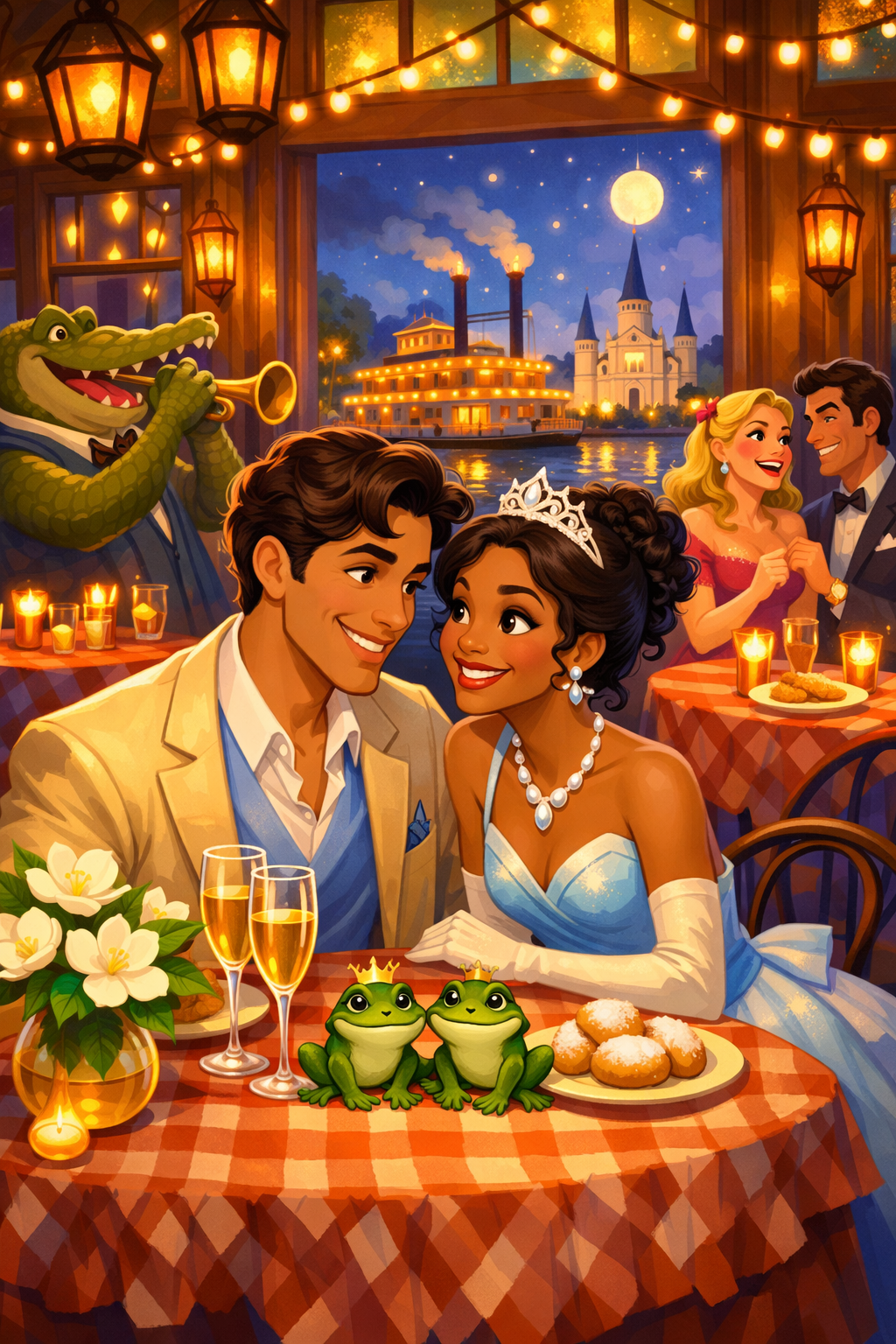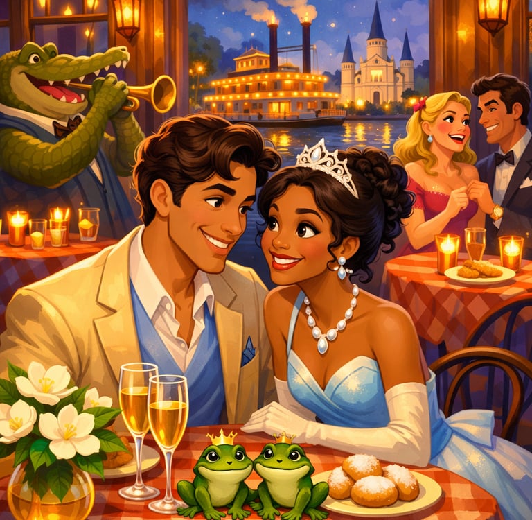 E assim, entre acordes suaves, luzes douradas e pratos quentinhos, Tiana e Naveen viveram uma história cheia de trabalho, amizade e amor verdadeiro.