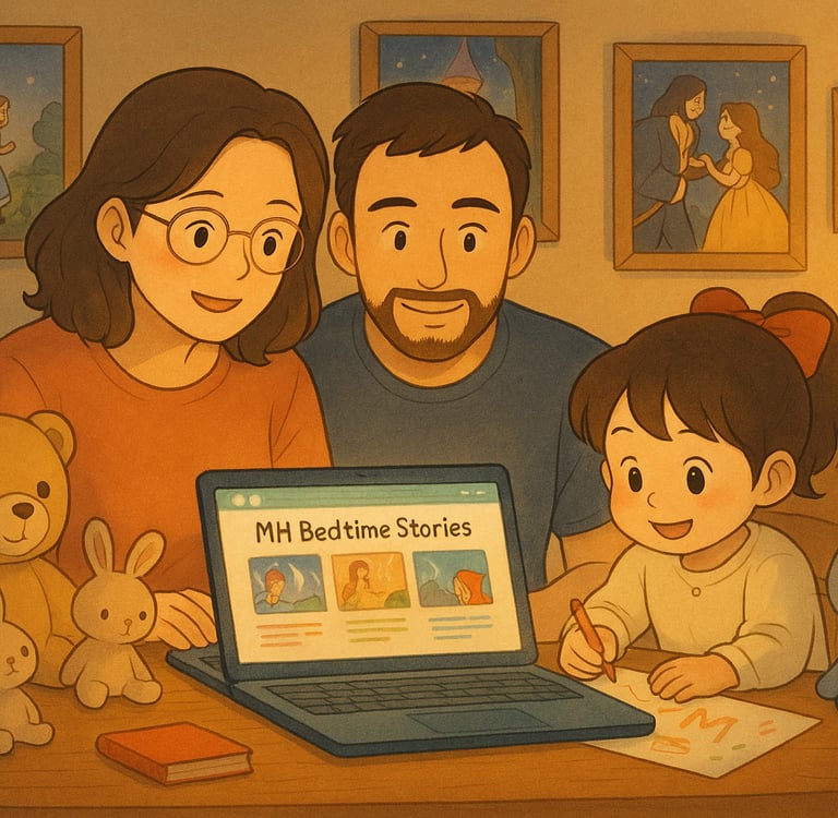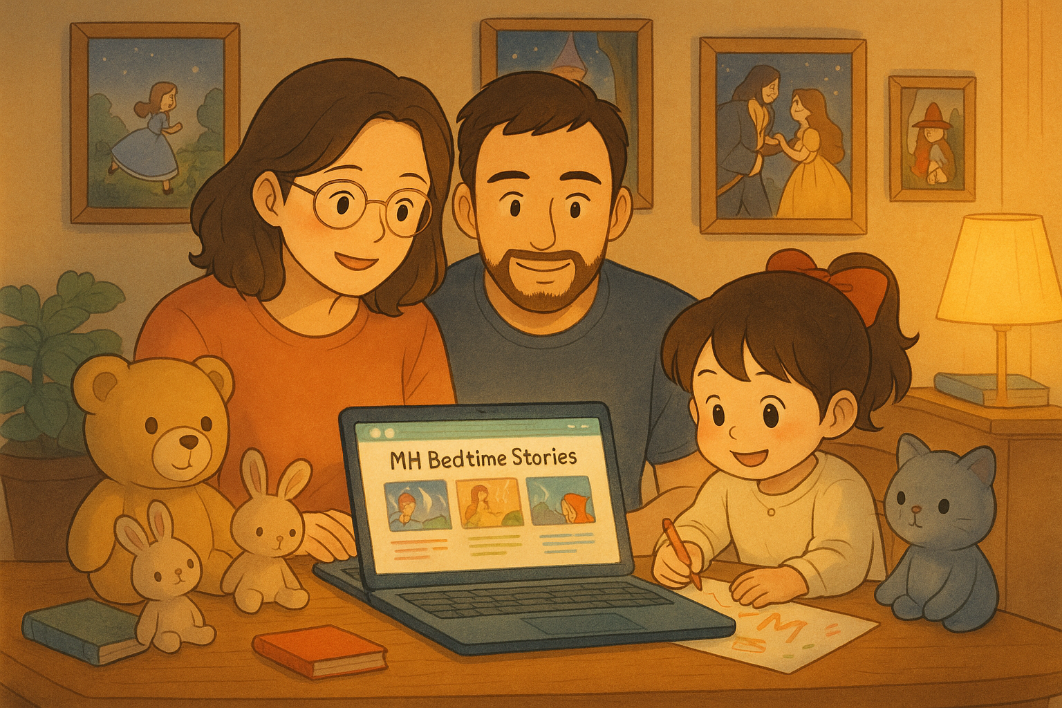 Somos os pais da MH, uma menina curiosa, sonhadora e cheia de imaginação. Desde que ela era bem pequena, desenvolvemos um ritual especial antes de dormir: contar historinhas. Algumas são inventadas na hora, outras são adaptações das nossas favoritas da infância — todas com um único objetivo: encher seus sonhos de magia, coragem e ternura.